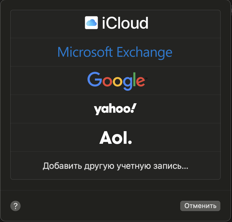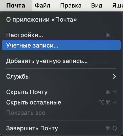 - В верхнем меню приложения Mail(Почта) выберите пункт Почта\Учетные записи