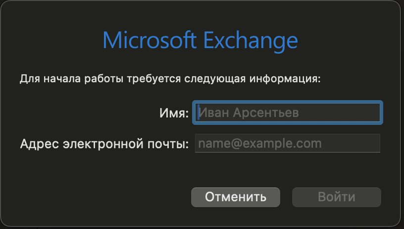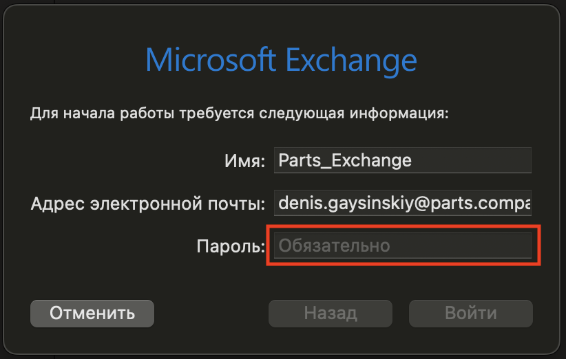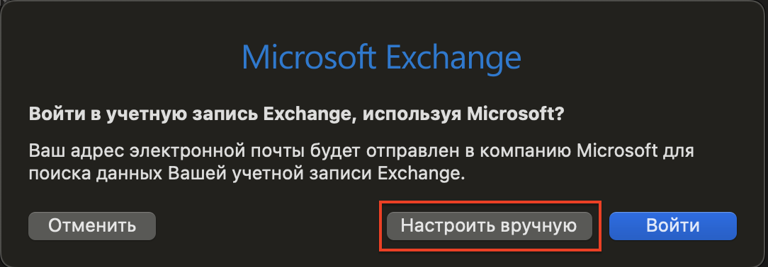 - В появившемся окне выбрать тип учетной записи Microsoft Exchange