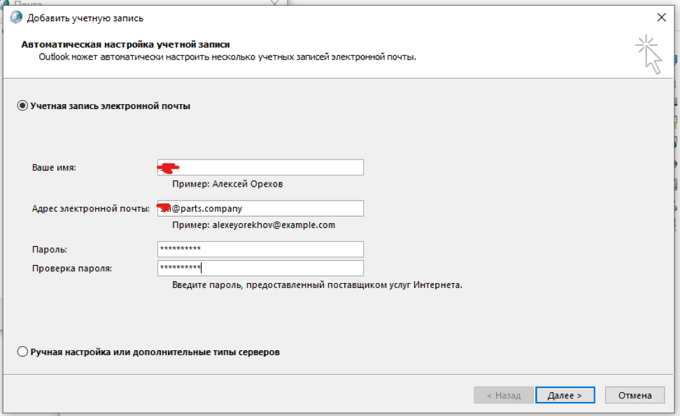 - В запросе на создание почтового ящика вводим выданные Вам «Адрес электронной почты» и «Пароль»
